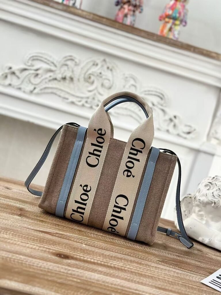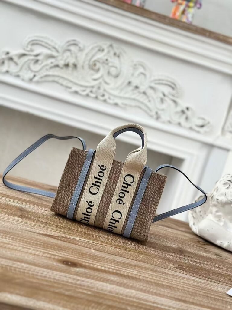 Chloe Woody linen pure cotton canvas and glossy crust, blue casual bag Small: 26.5*20*8cm