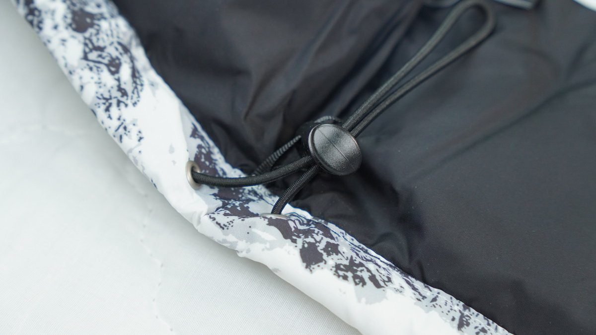 Brown, sand beige, down, ripstop plaid texture, logo embroidery on the chest, zipper pockets on both sides, and drawstring hem.